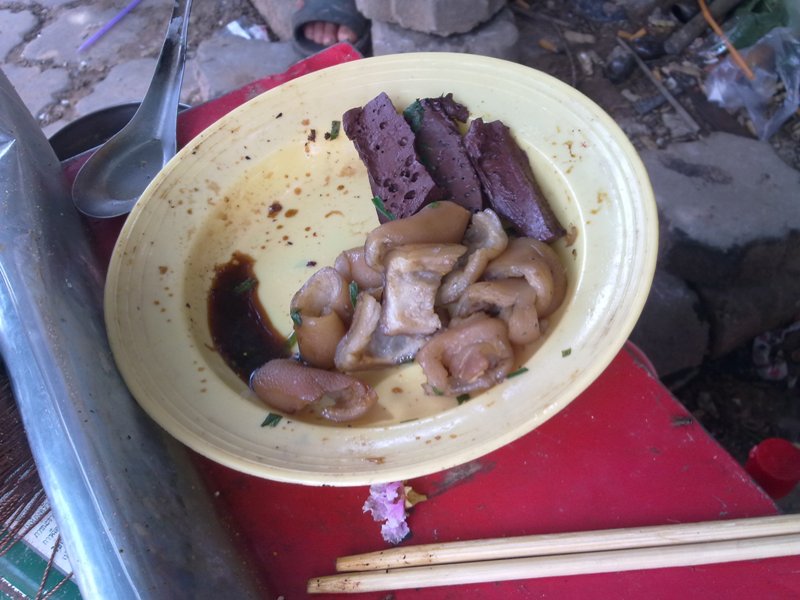 煮込んだ豚の皮と、豚の血を固めて煮た物だ。