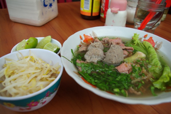 米で出来た細い素麺のような麺と肉団子や香草がスープに浸かっている。