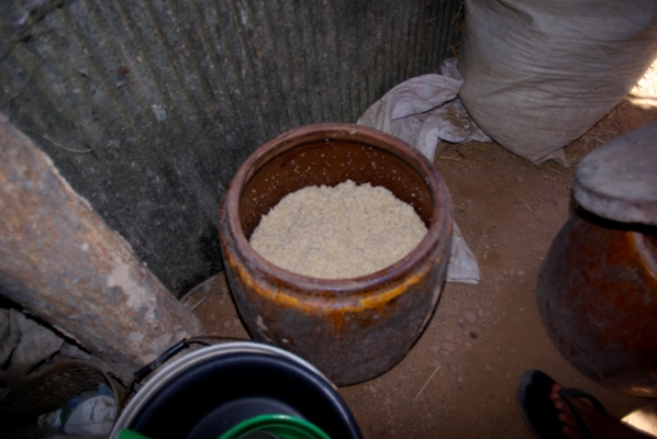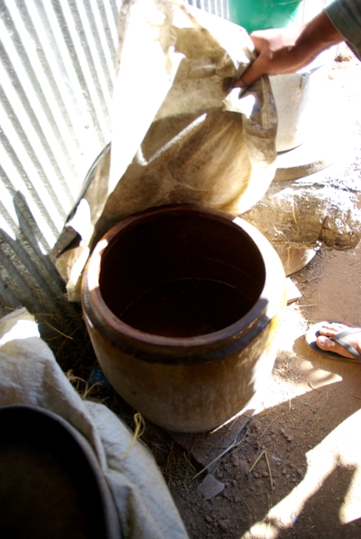 村人はペットボトルやお気に入りの瓶などを自分で持参し、この甕から別けて貰う。