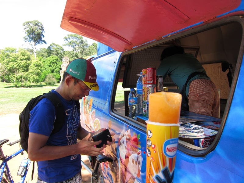 象のテラス前でアイスを食べ、火照った体を冷やし