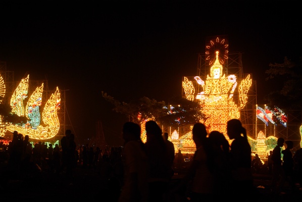 川上には巨大な灯篭が立ち並び、近くでは屋台が無数に並んでいる。王宮周辺の広場では、舞台が組まれ、多数の有名な歌手が歌っていた。